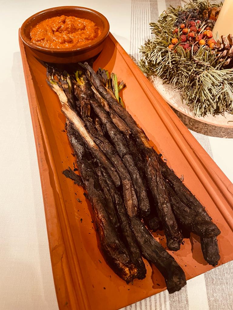 El calçot es una variedad de cebolla dulce que se cultiva principalmente en Cataluña, y su temporada se encuentra entre los meses de noviembre y abril. Los calçots se cocinan a la brasa y se acompañan con una salsa romesco. Es una comida típica para disfrutar en familia o con amigos, ya que se trata de un plato para compartir.